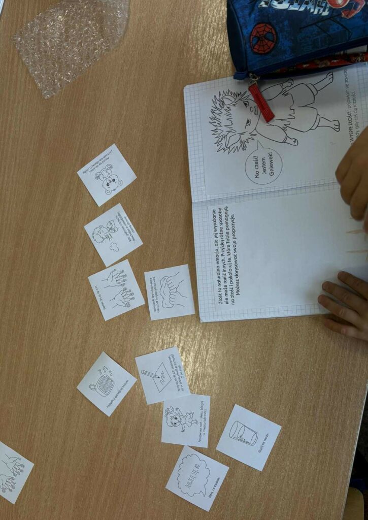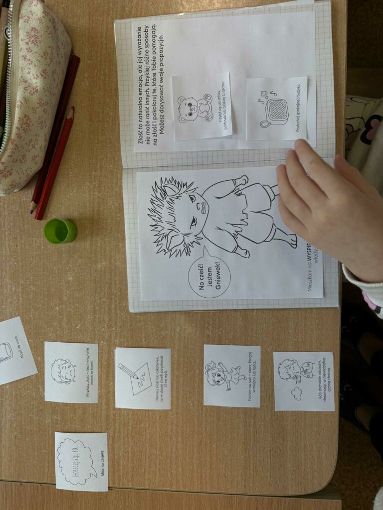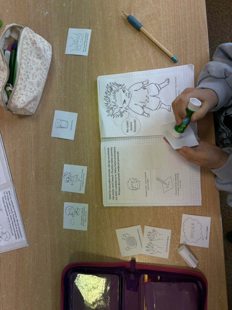Na zakończenie spotkania dzieci pracowały z Emocjonalną Książeczką. Oprócz ilustracji Gniewka otrzymały również specjalną wklejkę, na której umieściły swoje własne sposoby radzenia sobie ze złością. Zajęcia były kolejnym ważnym krokiem w rozwijaniu u najmłodszych umiejętności rozpoznawania, nazywania i regulowania emocji.