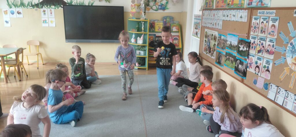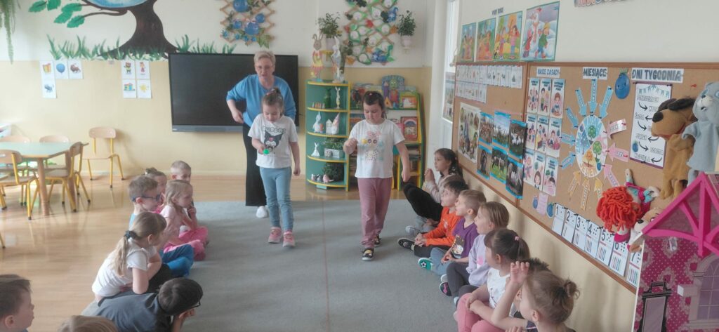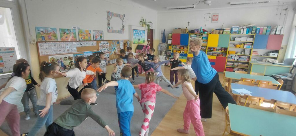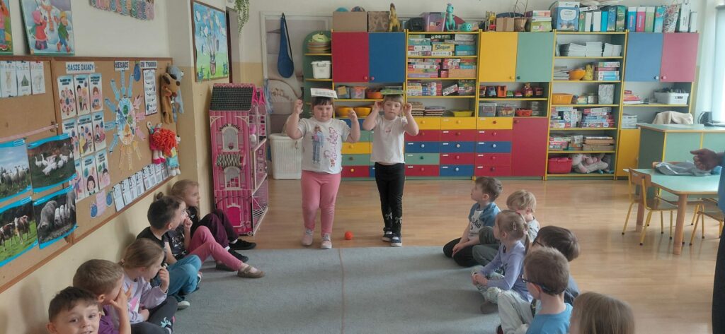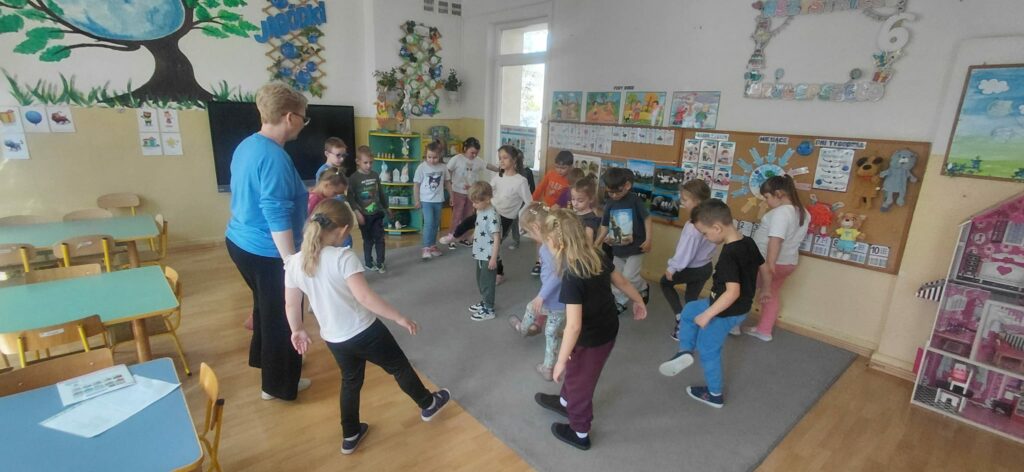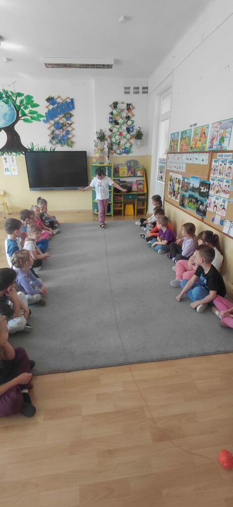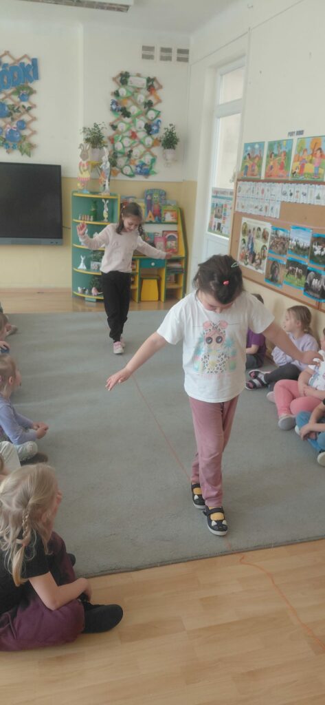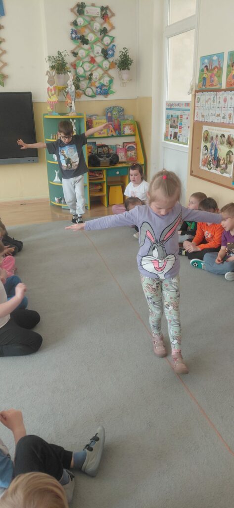 Celem tego spotkania było wsparcie rozwoju sensorycznego dzieci. Po wysłuchaniu opowiadania „Mam przyjaciółkę baletnicę” uczestnicy zrozumieli jak ważny choć często nie doceniany jest zmysł równowagi. Tytułowa baletnica jest tego przykładem. Wiele codziennych czynności, które wykonujemy wymagają naszej równowagi jak chociażby jazda na rowerze, rolkach czy łyżwach. Po rozmowie na temat zmysłu równowagi przeszliśmy do ćwiczeń. Pierwszym zadaniem było wykonanie „jaskółki” a następnie pisaliśmy literki jedną nogą na podłodze. Kolejnym wyzwaniem był wyścig z jajkiem na łyżce oraz przejście od startu do mety z książką na głowie. Zabawa „dojdź do mety”, w której dzieci musiały pokonać wyznaczoną drogę po sznurku a także zabawa „Raz, dwa, trzy baba jaga patrzy” sprawiły, że uczestnicy spotkania mogli rozwinąć swój zmysł równowagi.