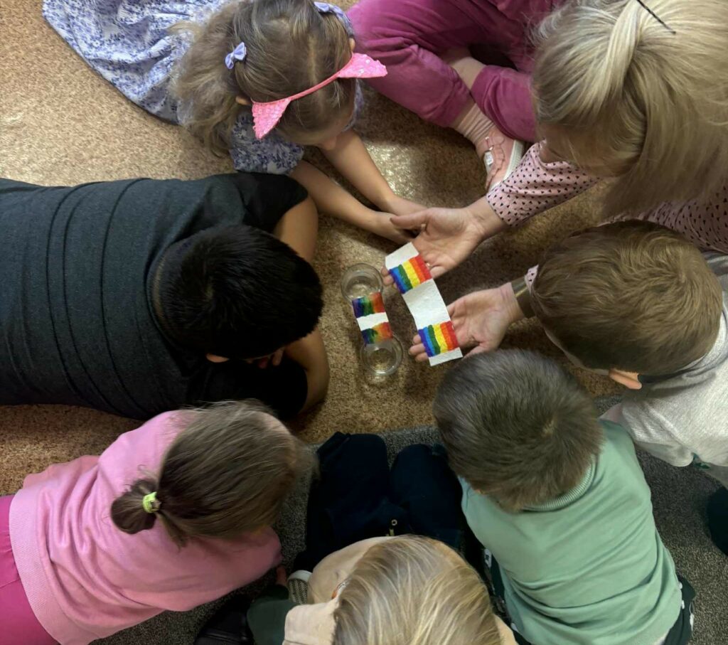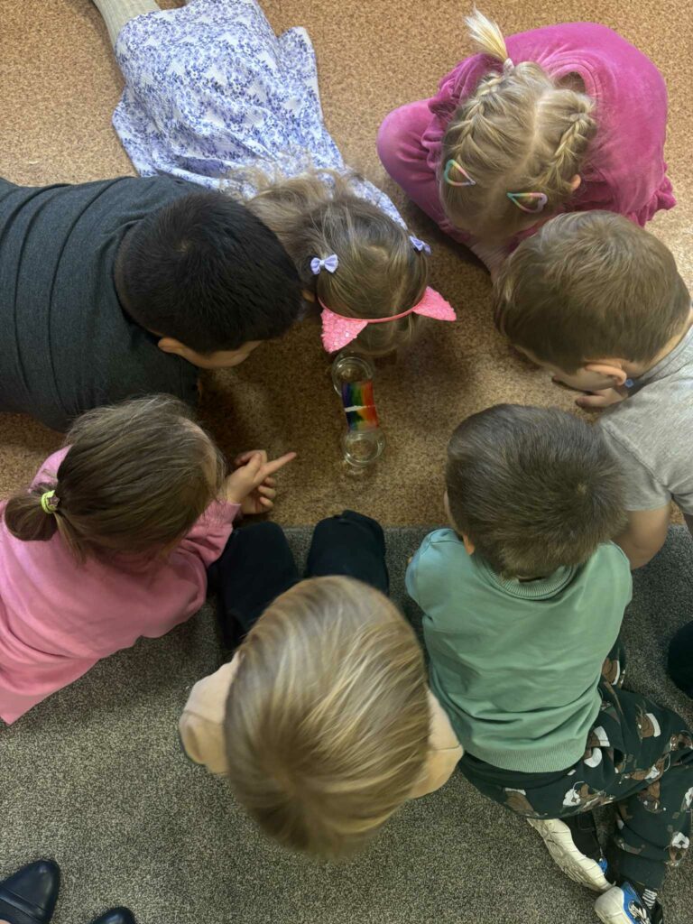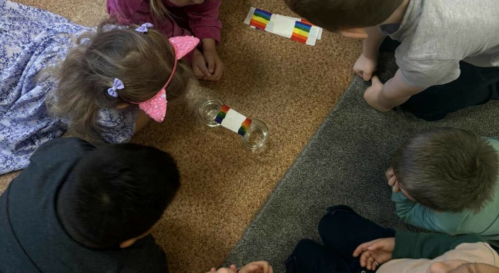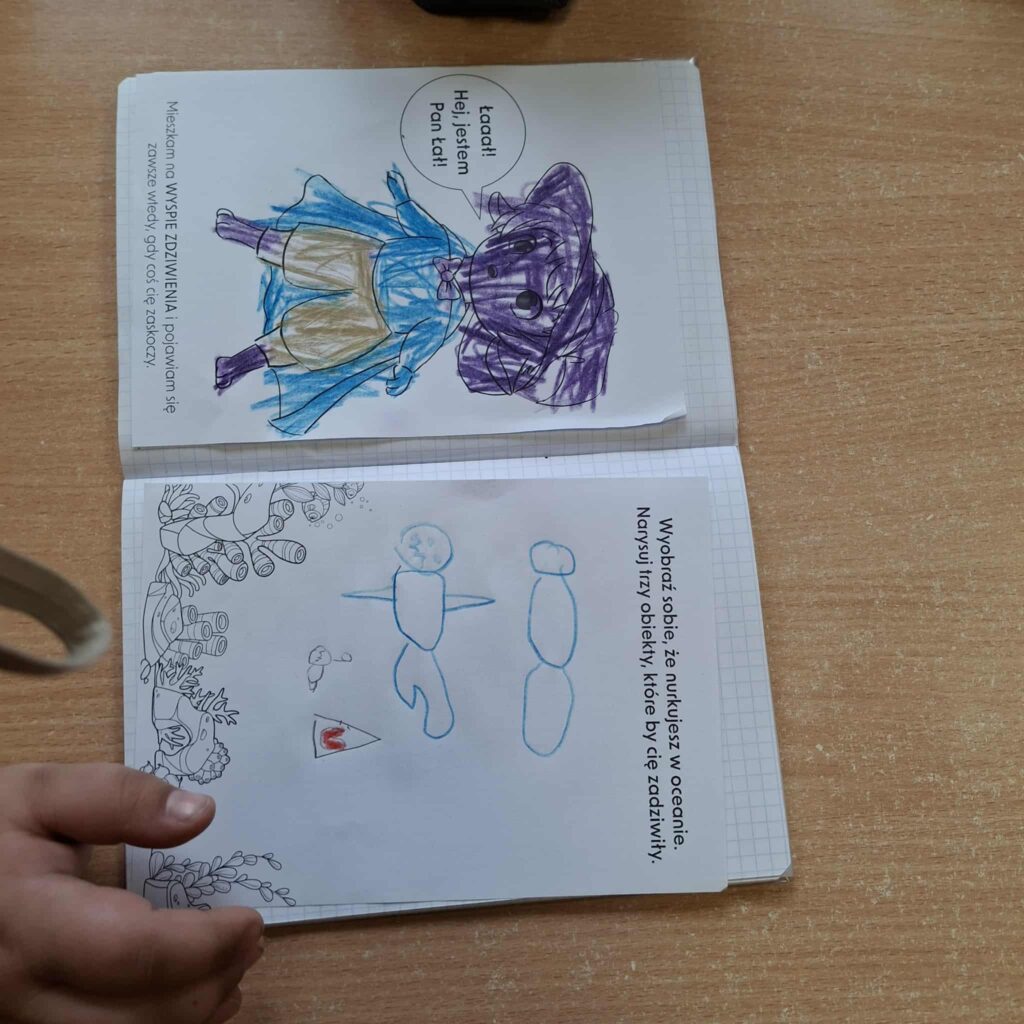 Nie zabrakło też pracy z Emocjonalną Książeczką, dzięki której dzieci mogły zastanowić się, co je zadziwia, cieszy i zachwyca. Spotkanie było pełne wrażeń, kolorów i radości – idealne, by uczyć się przez zabawę i odkrywać magię codziennych zjawisk.