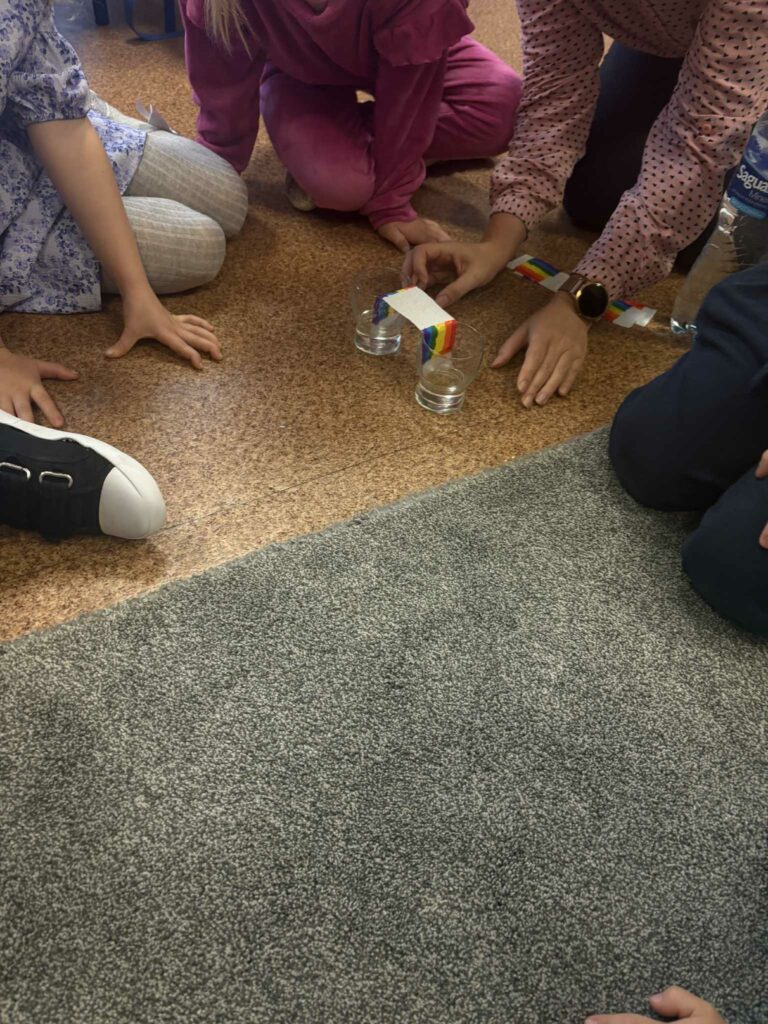 Po przeczytaniu bajki „Pan Łał z Wyspy Zdziwienia” p. Moniki Majewskiej, dzieci przeniosły się w świat eksperymentów. Wspólnie wykonaliśmy: „efekt spadających gwiazd”, „wędrującą tęczę” oraz „zabarwiane kwiatki”. Ten ostatni eksperyment – prawdziwy efekt „Łał” – przedszkolaki zobaczą dopiero następnego dnia, gdy kwiatki nabiorą barw.