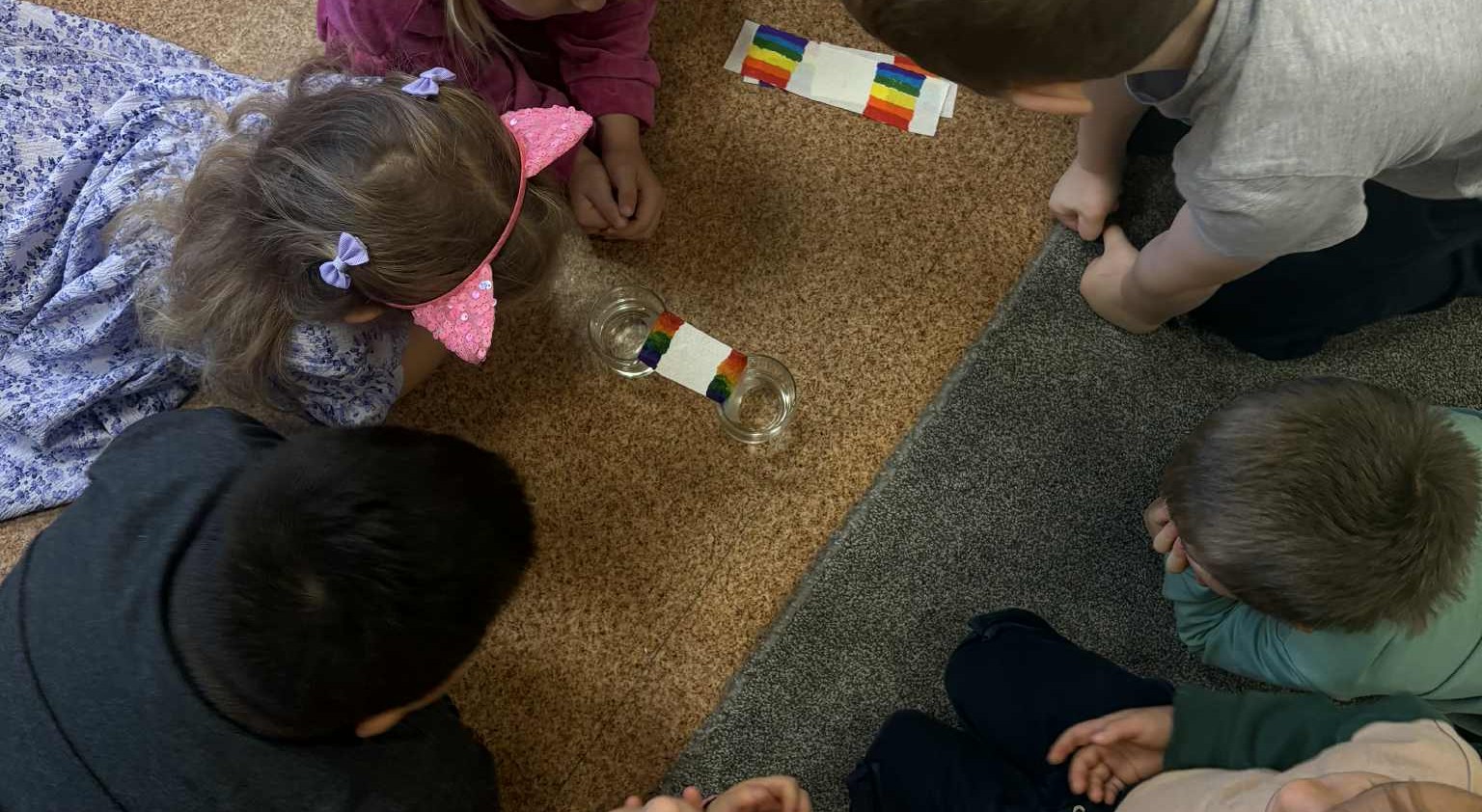 Po przeczytaniu bajki „Pan Łał z Wyspy Zdziwienia” p. Moniki Majewskiej, dzieci przeniosły się w świat eksperymentów. Wspólnie wykonaliśmy: „efekt spadających gwiazd”, „wędrującą tęczę” oraz „zabarwiane kwiatki”. Ten ostatni eksperyment – prawdziwy efekt „Łał” – przedszkolaki zobaczą dopiero następnego dnia, gdy kwiatki nabiorą barw.