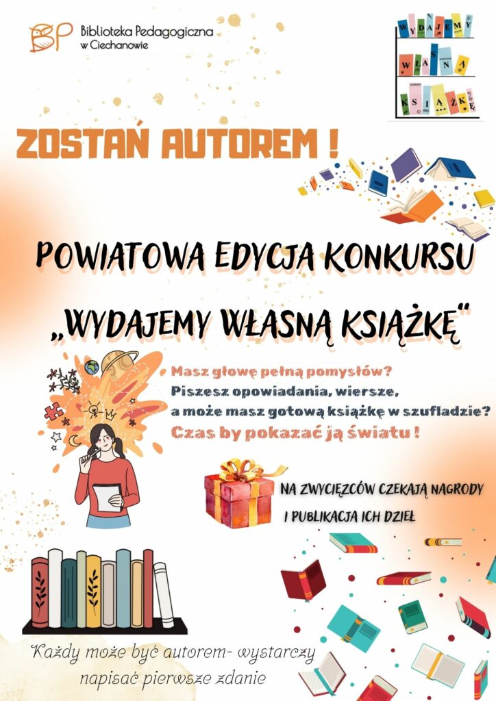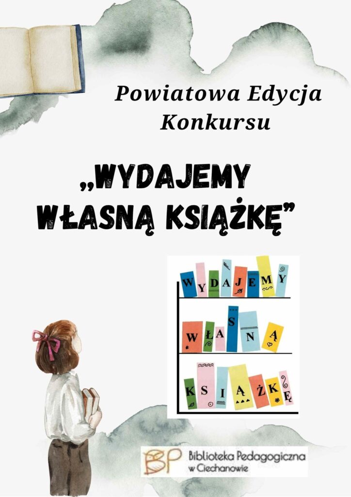 Z przyjemnością informujemy, że rozstrzygnęliśmy konkurs plastyczny na plakat promujący Powiatową Edycję Konkursu „Wydajemy Własną Książkę”, który był adresowany do nauczycieli z terenu powiatu ciechanowskiego. Nasze przedsięwzięcie honorowym patronatem objął Pan Jan Andrzej Kaluszkiewicz Starosta Powiatu Ciechanowskiego. Sponsorem nagród dla laureatów było Starostwo Powiatowe w Ciechanowie.