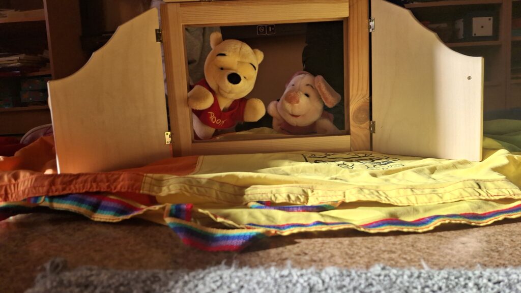 W dalszej części spotkania dzieci uczestniczyły w ćwiczeniach praktycznych – przygotowały krótkie wystąpienia indywidualne oraz prezentacje z wykorzystaniem pacynek w teatrzyku kamishibai. Następnie omówiliśmy, które formy aktywności były dla nich trudniejsze, a które łatwiejsze.