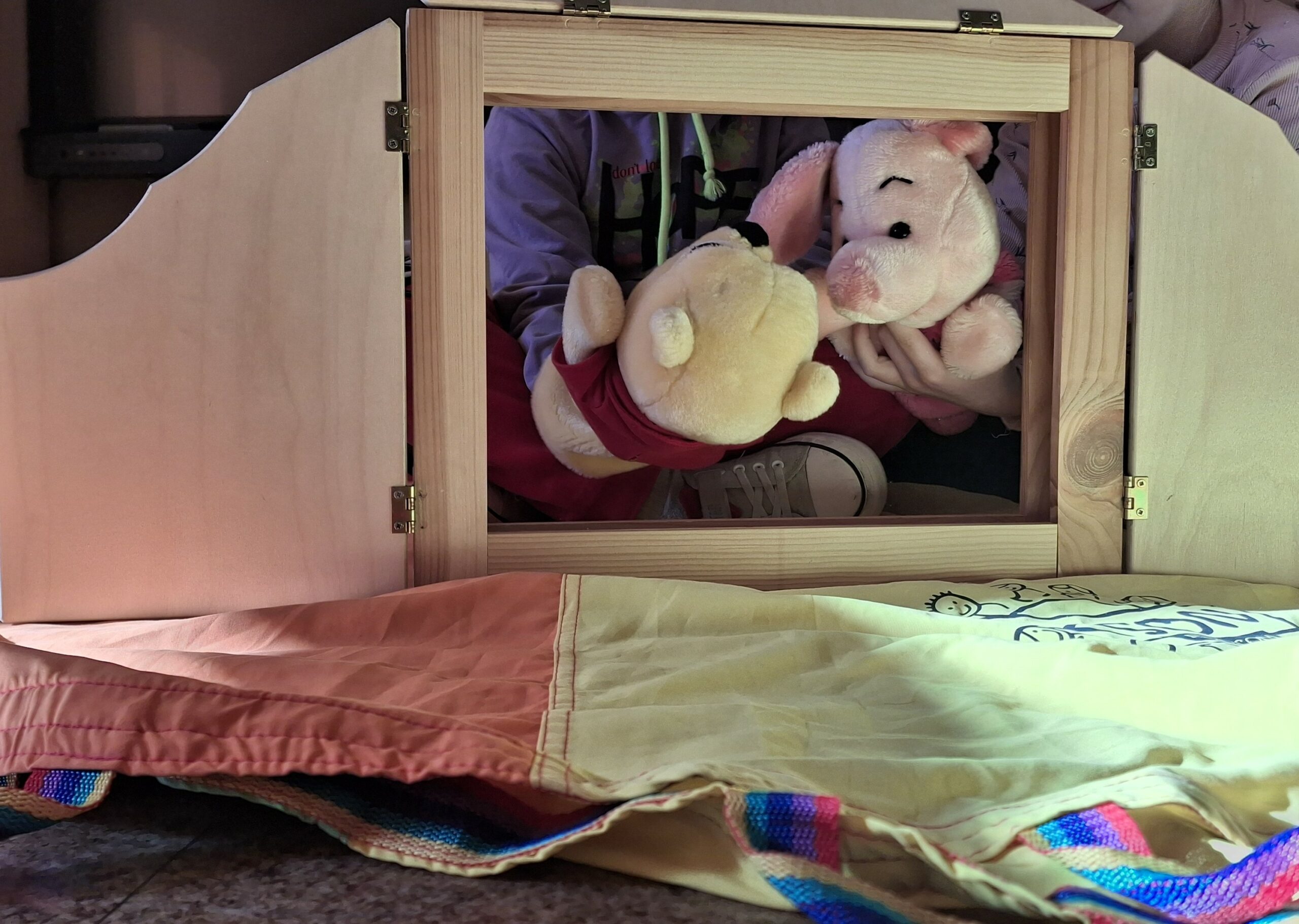 W dalszej części spotkania dzieci uczestniczyły w ćwiczeniach praktycznych – przygotowały krótkie wystąpienia indywidualne oraz prezentacje z wykorzystaniem pacynek w teatrzyku kamishibai. Następnie omówiliśmy, które formy aktywności były dla nich trudniejsze, a które łatwiejsze.