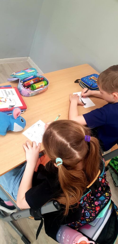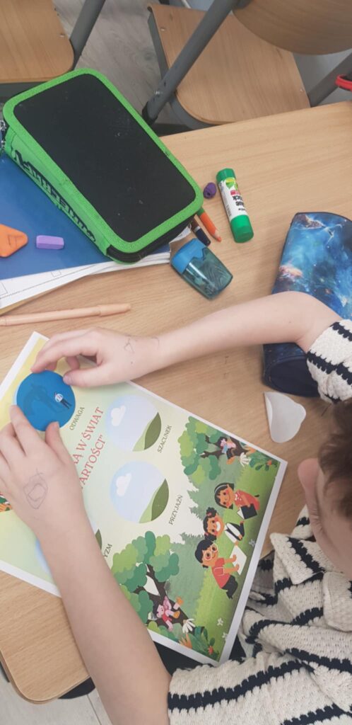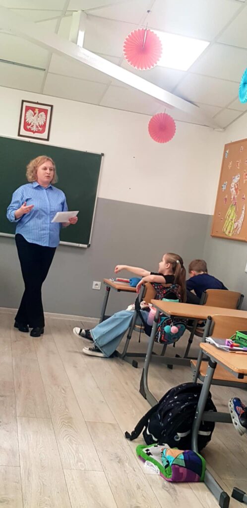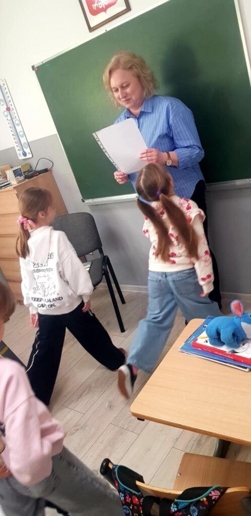 Tym razem tematem zajęć była odwaga. Uczniowie wysłuchali opowiadania pt. „Odwagi zajączku”, które stało się punktem wyjścia do rozmowy o tym, czym jest odwaga i w jakich sytuacjach można ją okazywać. Dzieci dzieliły się swoimi doświadczeniami oraz przykładami sytuacji, w których czuły strach, ale potrafiły go przezwyciężyć. Aktywnie uczestniczyły w przygotowanych zadaniach. W zabawie „lustro odwagi” musiały spojrzeć w zwierciadło i dokończyć zdanie „Jestem odważny/a, ponieważ…”. Kolejna zabawa „Tunel odwagi” pozwoliła dzieciom symbolicznie zmierzyć się z lękiem i przejść przez niego z pomocą grupy. Uczniowie podczas tego ćwiczenia dodawali sobie otuchy oraz wspierali swoich kolegów i koleżanki. Na zakończenie spotkania pierwszoklasiści wykonali rysunki tego, czego się boją najbardziej i zamknęli je w „pożeraczu strachów”, czyli w specjalnym pudełku. Dzięki temu zadaniu mogli nazwać swoje obawy i „pozbyć się” ich w bezpieczny, kreatywny sposób.