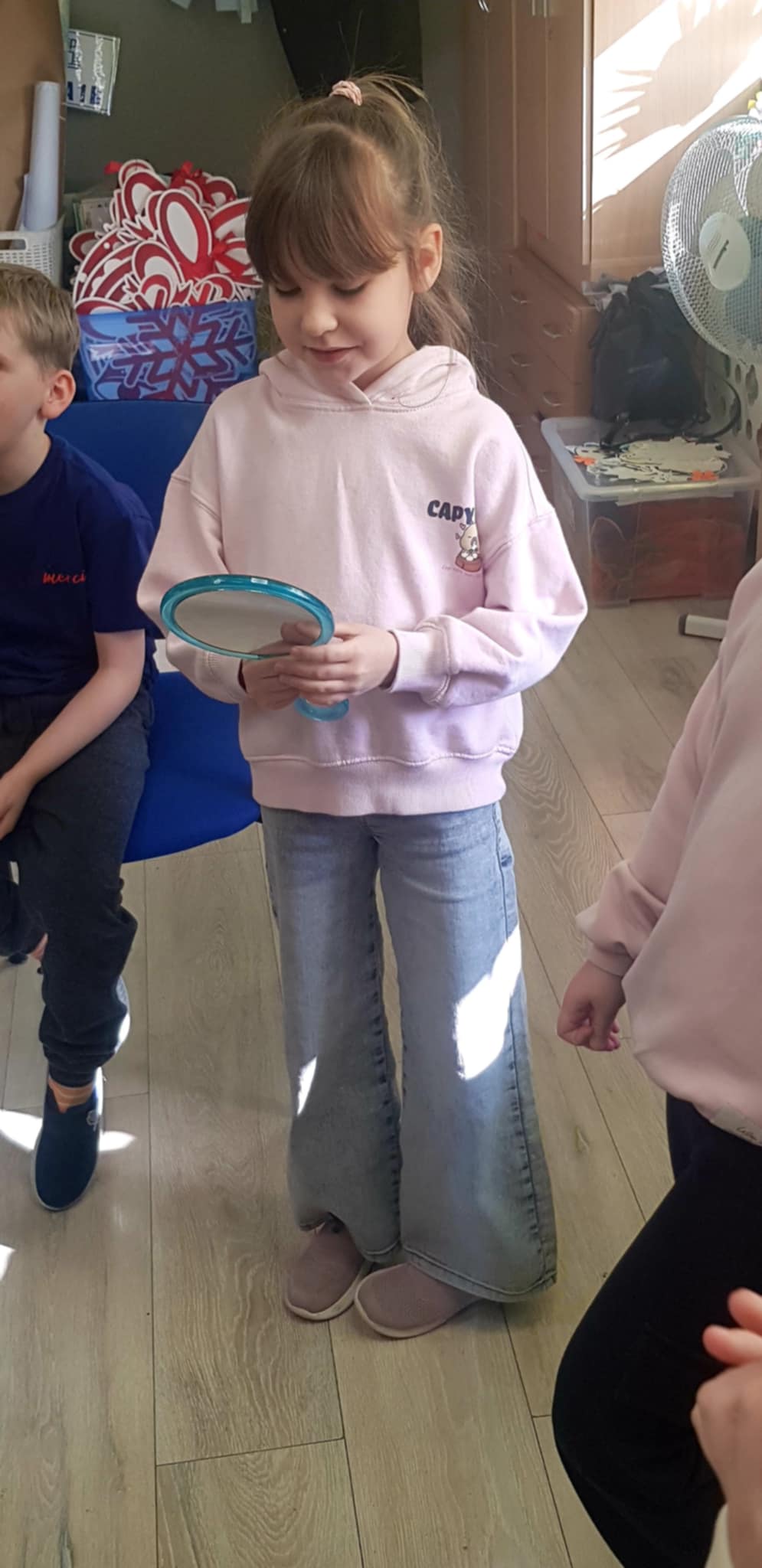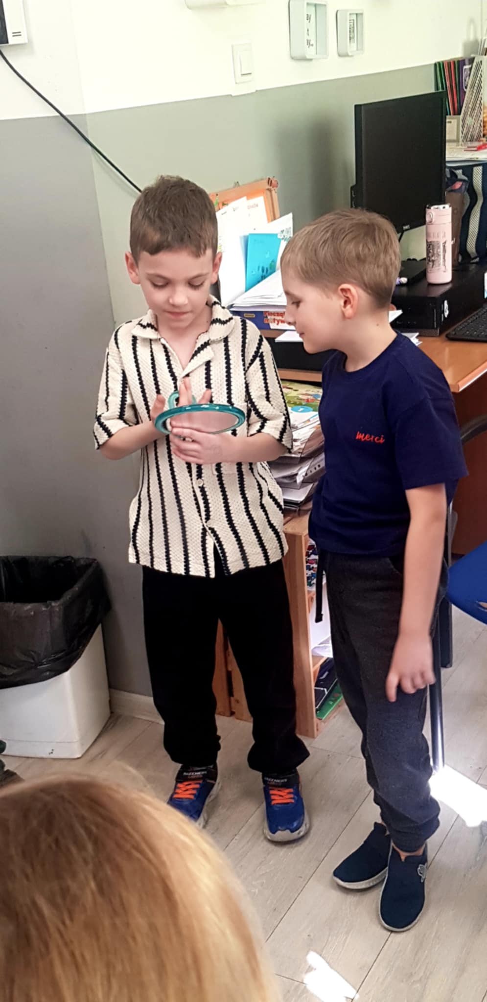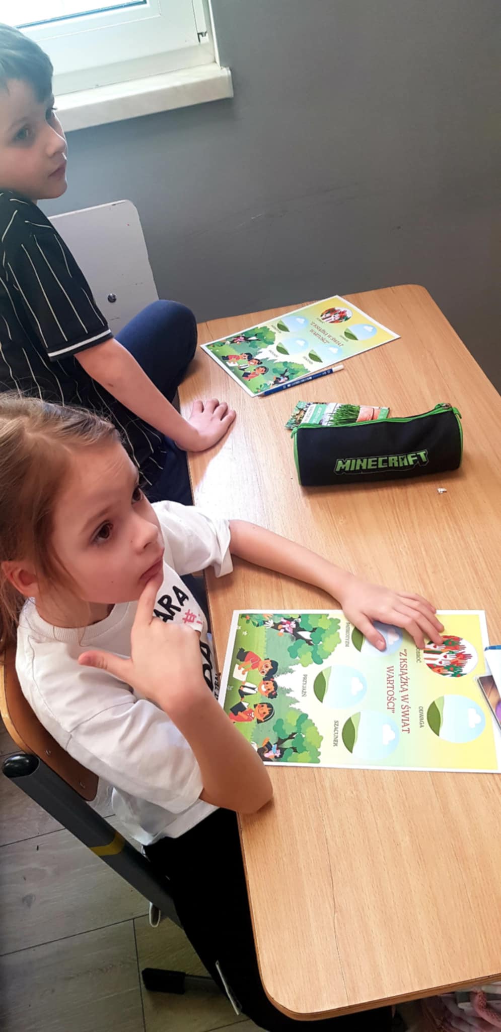 Tym razem tematem zajęć była odwaga. Uczniowie wysłuchali opowiadania pt. „Odwagi zajączku”, które stało się punktem wyjścia do rozmowy o tym, czym jest odwaga i w jakich sytuacjach można ją okazywać. Dzieci dzieliły się swoimi doświadczeniami oraz przykładami sytuacji, w których czuły strach, ale potrafiły go przezwyciężyć. Aktywnie uczestniczyły w przygotowanych zadaniach. W zabawie „lustro odwagi” musiały spojrzeć w zwierciadło i dokończyć zdanie „Jestem odważny/a, ponieważ…”. Kolejna zabawa „Tunel odwagi” pozwoliła dzieciom symbolicznie zmierzyć się z lękiem i przejść przez niego z pomocą grupy. Uczniowie podczas tego ćwiczenia dodawali sobie otuchy oraz wspierali swoich kolegów i koleżanki. Na zakończenie spotkania pierwszoklasiści wykonali rysunki tego, czego się boją najbardziej i zamknęli je w „pożeraczu strachów”, czyli w specjalnym pudełku. Dzięki temu zadaniu mogli nazwać swoje obawy i „pozbyć się” ich w bezpieczny, kreatywny sposób.